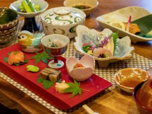 絹鱒黄味寿司 明日葉浸し 干し葡萄白ワイン煮